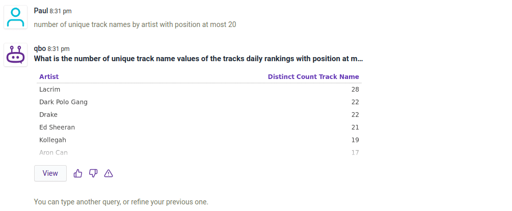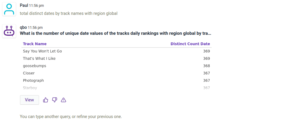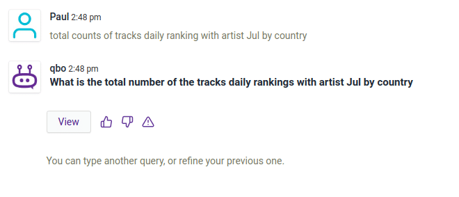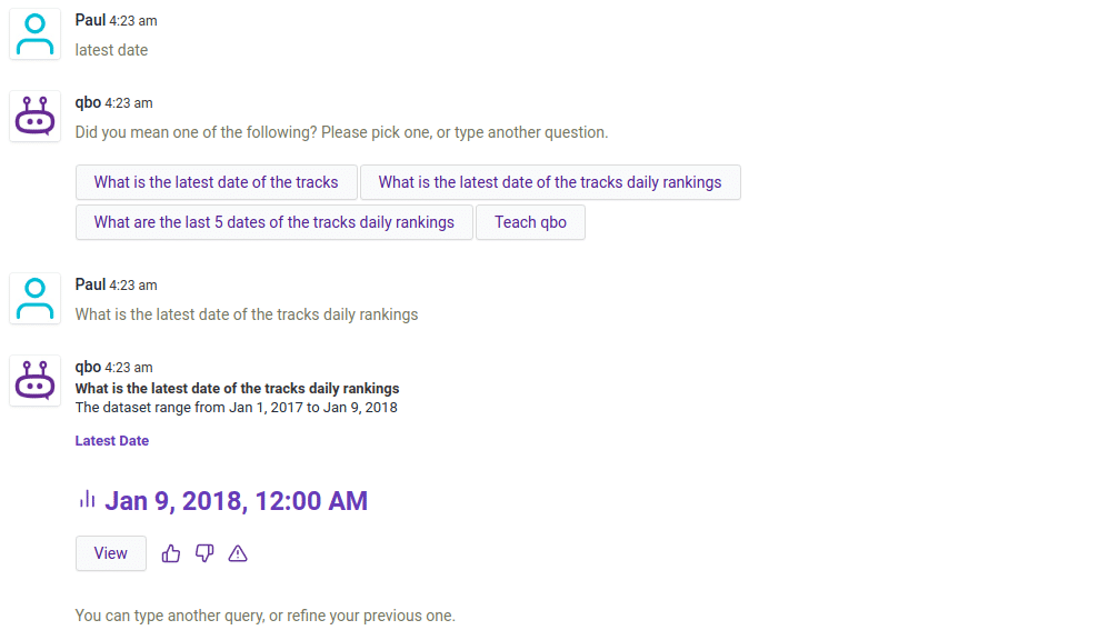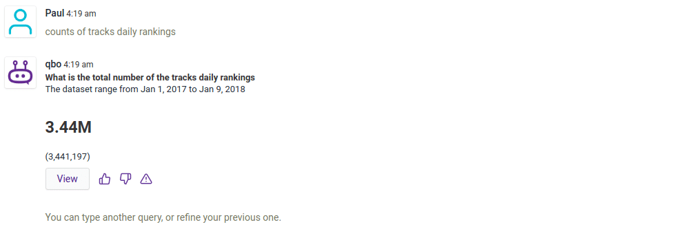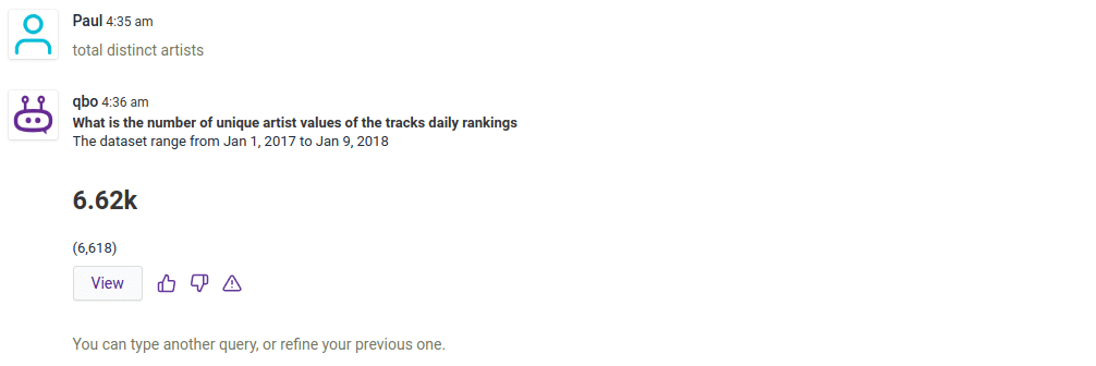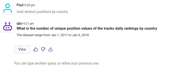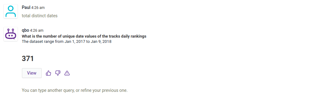 Before using Qbo for data exploration and deriving insights, it is important to make sure that the data is configured correctly inside Qbo. This will provide confidence that we are processing the right data and also a good starting point to get familiar with the content of the data. To access conversational analytics, we use Qbo’s chat interface directly to ask simple questions for data validation.