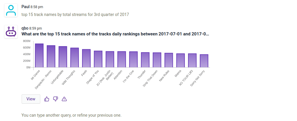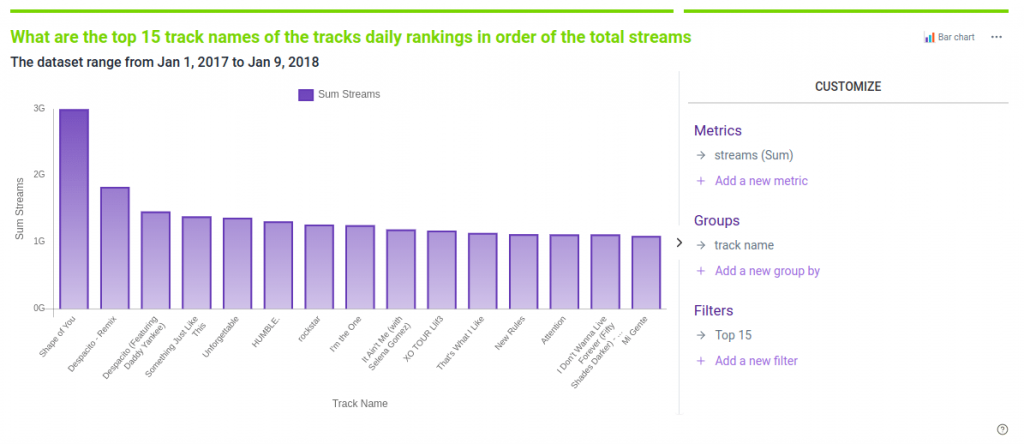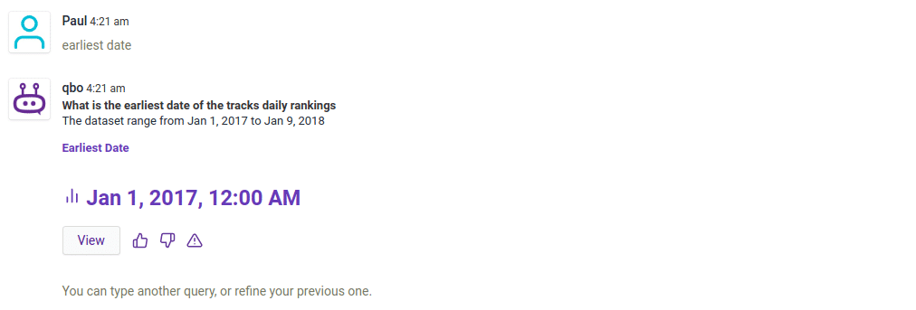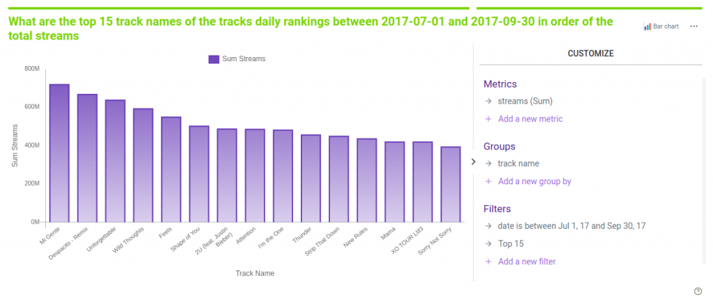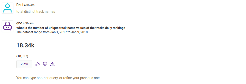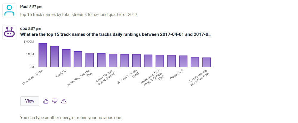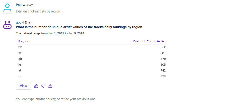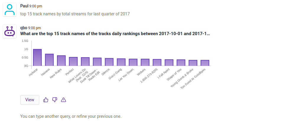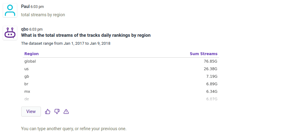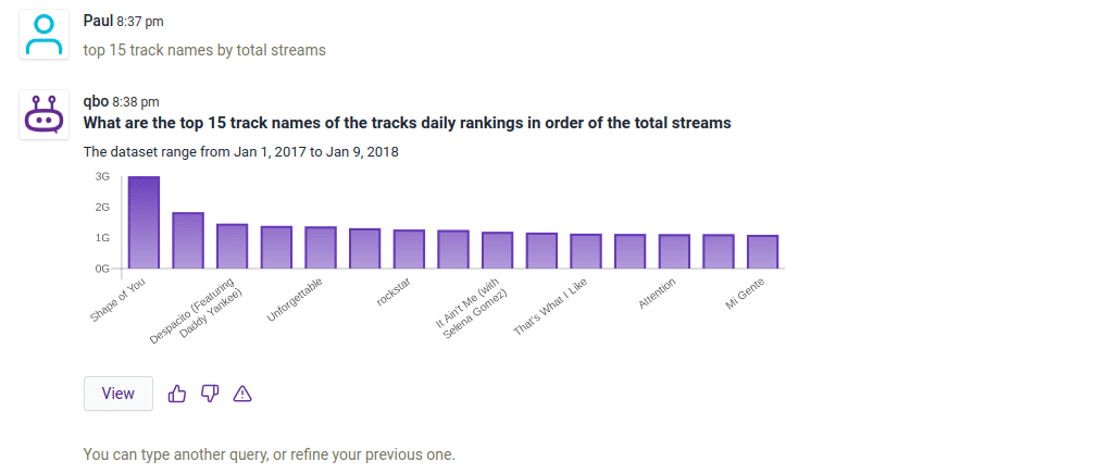 Let’s try to answer this question with data. One relevant dataset to answer this question comes from Spotify. In this article, we are going to explore the Spotify dataset from Kaggle website using Qbo and conversational analytics. Specifically, we shall show how conversational analytics can help answer interesting questions on datasets in an easy manner. We believe this paradigm can dramatically transform the way people interact with data, and give them more power to analyze data and come up with their own conclusions.