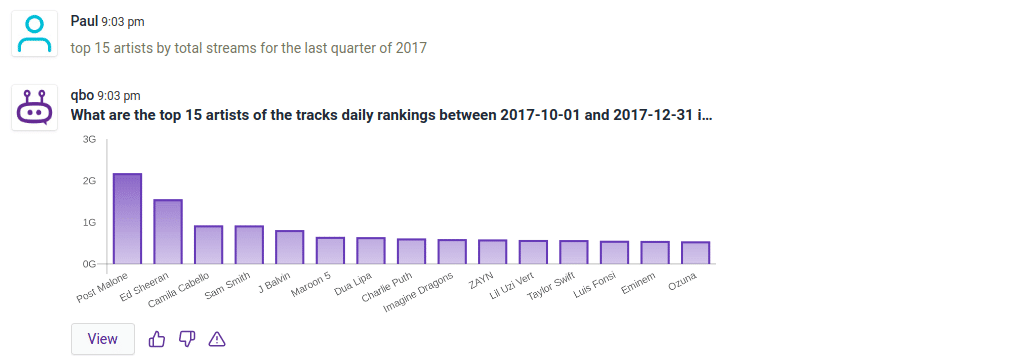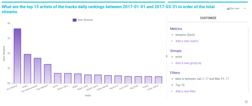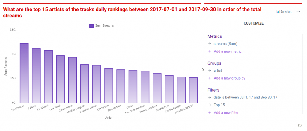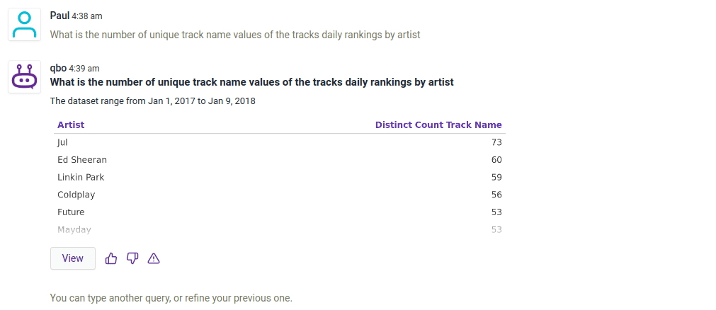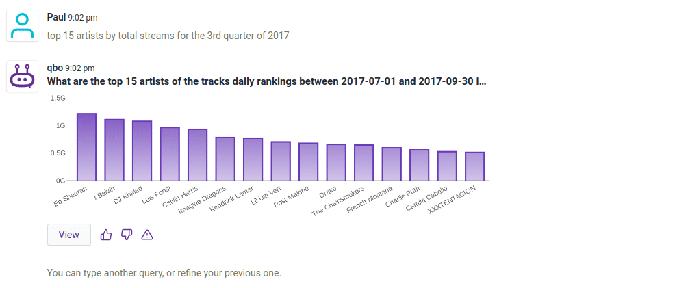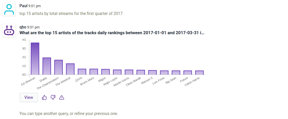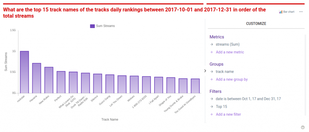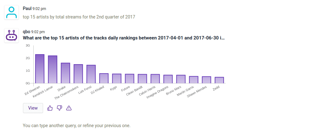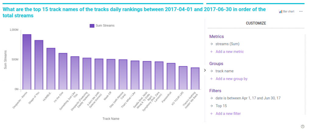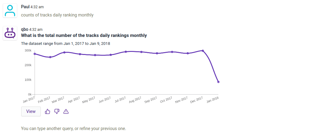 Let’s try to answer this question with data. One relevant dataset to answer this question comes from Spotify. In this article, we are going to explore the Spotify dataset from Kaggle website using Qbo and conversational analytics. Specifically, we shall show how conversational analytics can help answer interesting questions on datasets in an easy manner. We believe this paradigm can dramatically transform the way people interact with data, and give them more power to analyze data and come up with their own conclusions.