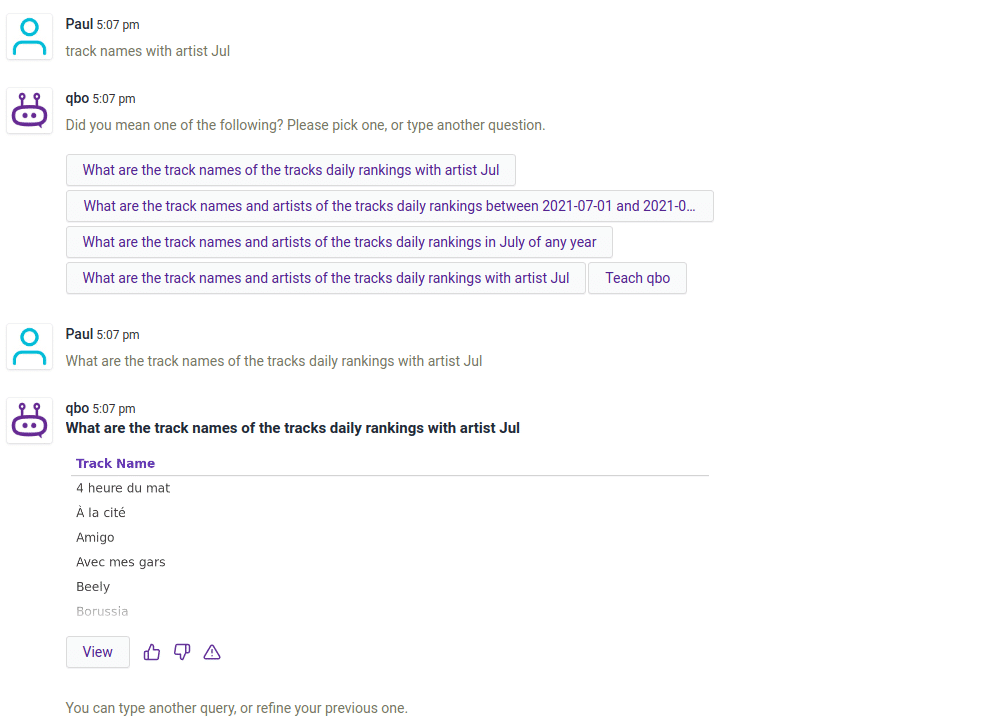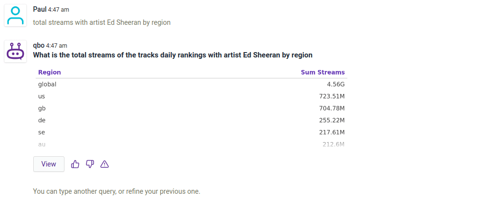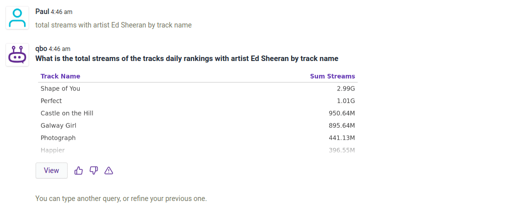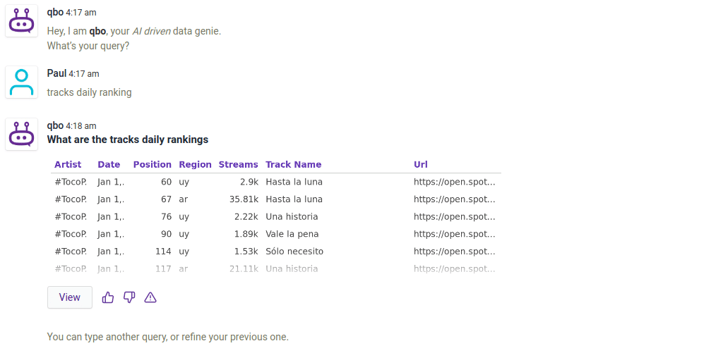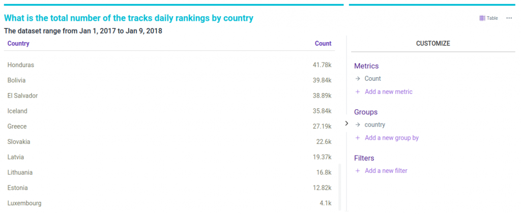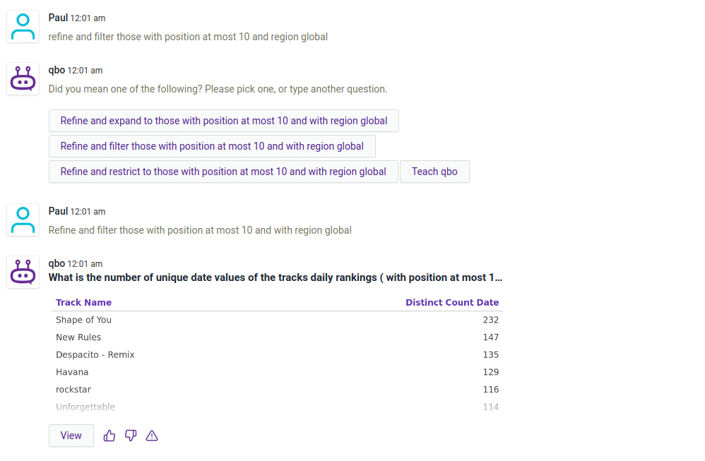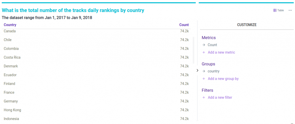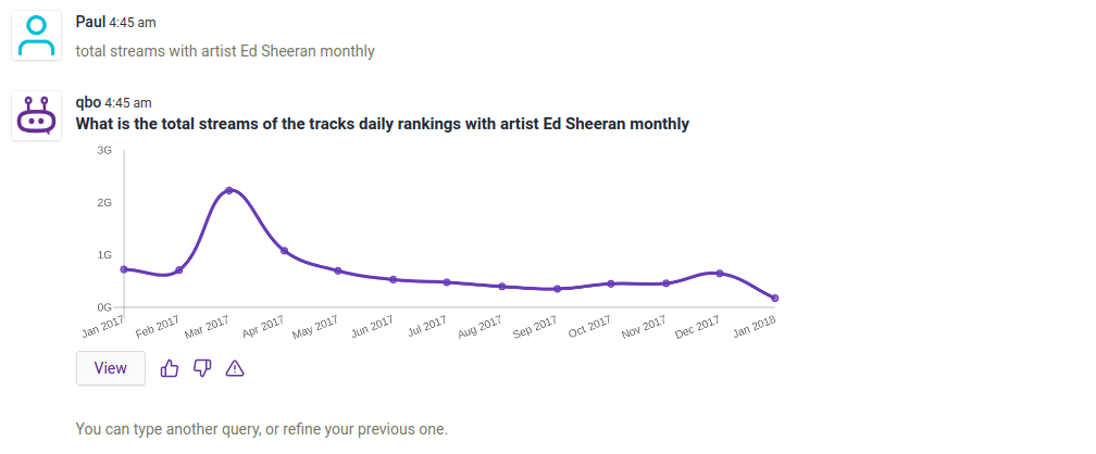 Let’s try to answer this question with data. One relevant dataset to answer this question comes from Spotify. In this article, we are going to explore the Spotify dataset from Kaggle website using Qbo and conversational analytics. Specifically, we shall show how conversational analytics can help answer interesting questions on datasets in an easy manner. We believe this paradigm can dramatically transform the way people interact with data, and give them more power to analyze data and come up with their own conclusions.