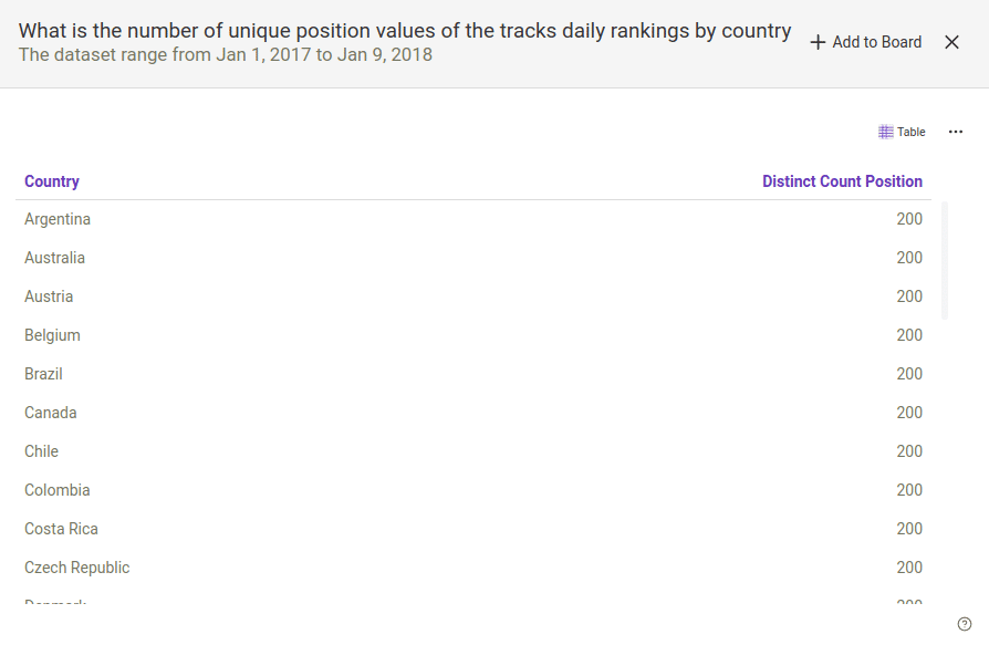 Which country/region listens to a variety of artists? Looks like Taiwan listens to a wide range of artists, interesting! We can discover this insight by querying for unique or distinct artists. Their top daily rankings change quite frequently too. Also, a side note, NLP still works even if a word is misspelled in the question.