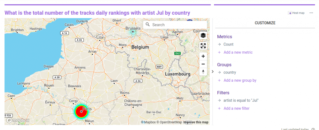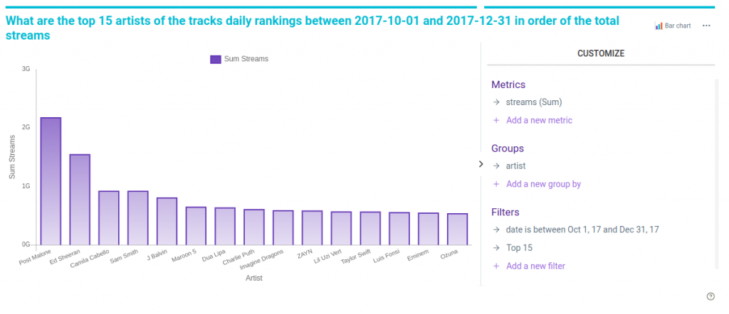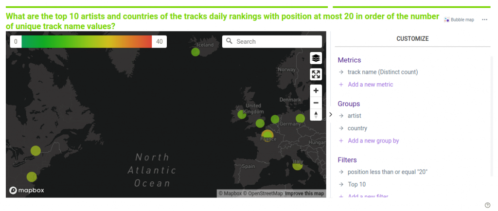 Now let’s get into some interesting insights using augmented analytics. Who are the top artists that had the most number of songs in the daily rankings? And we see that the top artist showing up is one that’s perhaps a bit unexpected. The artist named Jul has more songs in the top daily rankings compared to international artists like Ed Sheeran, Linkin Park, Coldplay, etc.