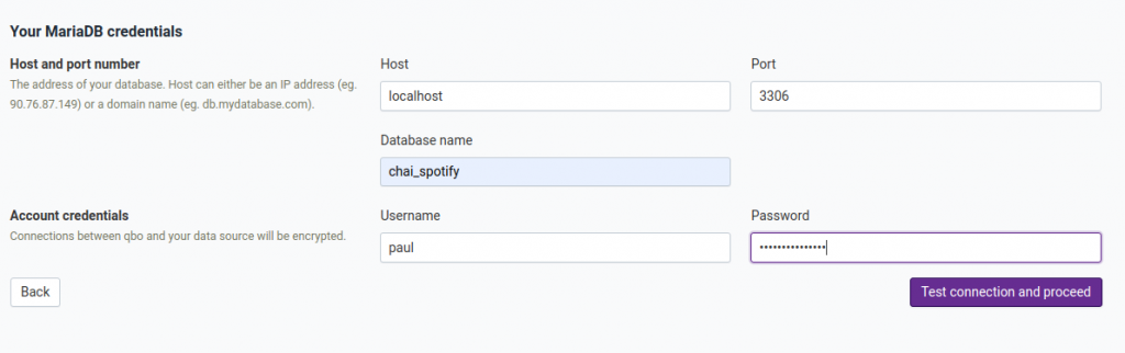 It has support for a wide array of database types. For this example, we will use a MariaDB instance to store the data and have Qbo connect to this MariaDB instance.