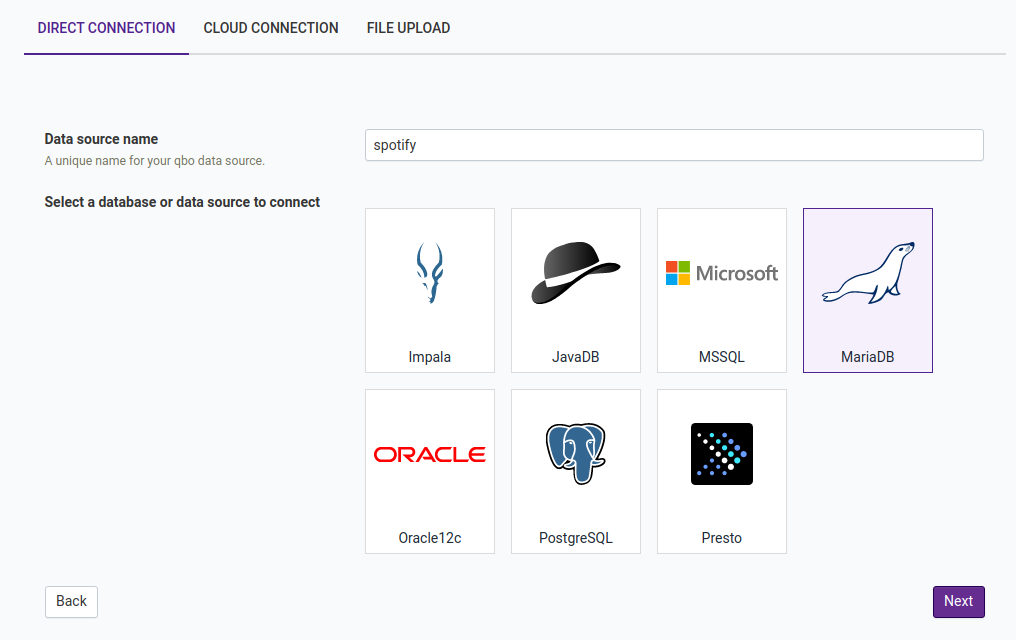 After creating the database containing the Spotify data and loading the data, we will set up the Qbo data source connection for some helpful augmented analytics in hand. After you log in as admin, go to the Data Sources section, add a new data source and select MariaDB.