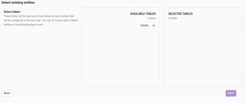 In the next section, all the tables inside the database will be shown for our next process, we need to indicate which of the tables are we going to connect. In this case, our database `chai_spotify` has only one table/entity called `tracks` which contain the data we downloaded from Kaggle website.
