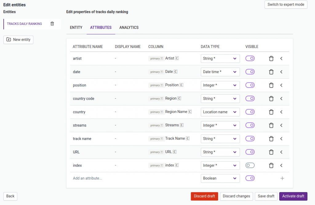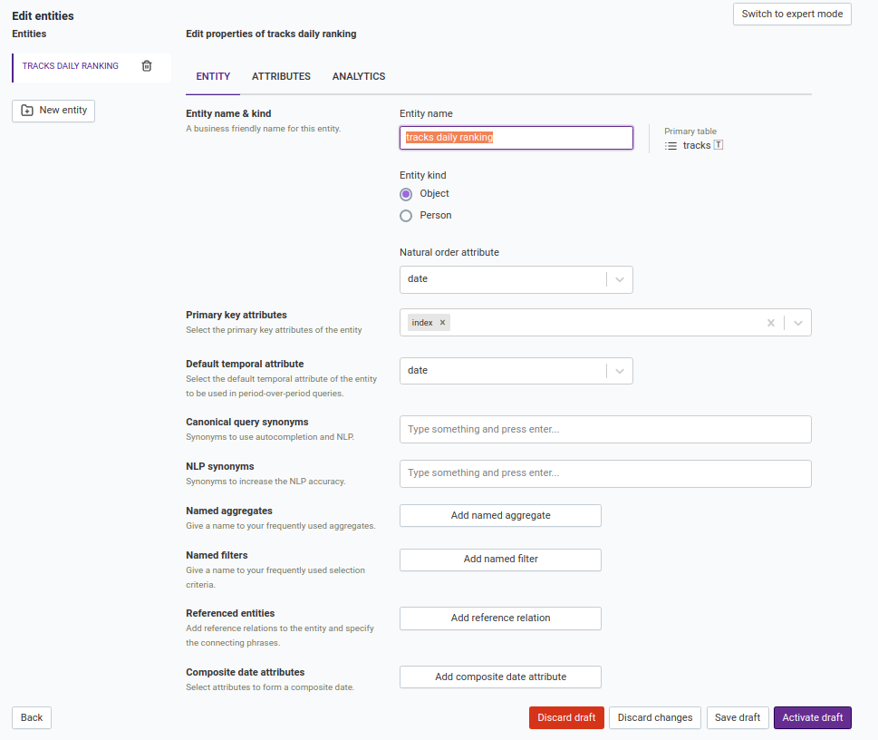After this, we can start with setting up additional details about our table/entity. Here we can rename the table, specify what kind it is, which attributes to use for ordering, which attribute to use by default for temporal queries, what are the primary keys, etc. For more details about how to set up, see the documentation.