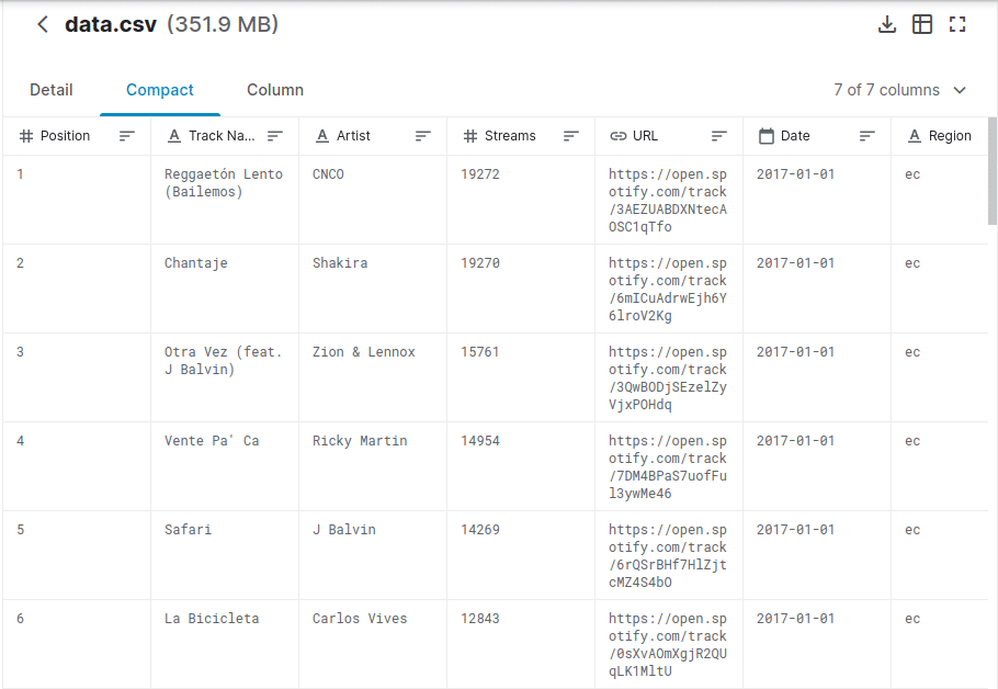 Spotify is one of the most popular music streaming services. This dataset contains the daily ranking of the 200 most listened songs in 53 countries from 2017 and 2018 by Spotify users. It contains more than 2 million rows, which comprises 6629 artists and 18598 songs. The data spans from 1st January 2017 to 9th January 2018 and was collected from Spotify’s regional chart data.