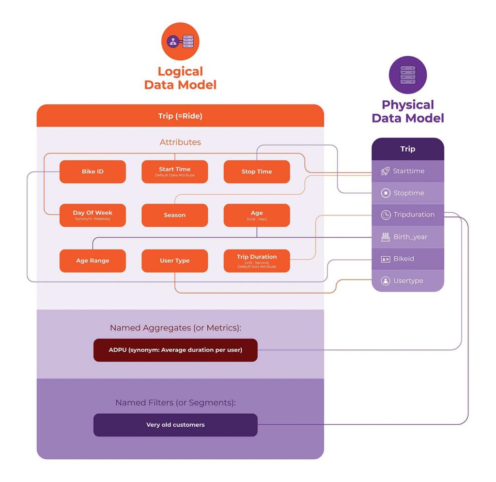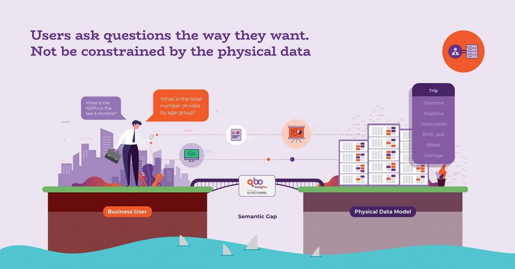 Bridging this gap requires some notion of a logical data model that lies closer to the business user’s understanding of the world. The logical data model can be mapped to the physical data model. For instance, it might define formulas for ADPU or ways of computing age and age groups from birth year. It might define synonyms for Trips. Refer here for a deeper dive into the logical data model that underpins Unscrambl’s Qbo.