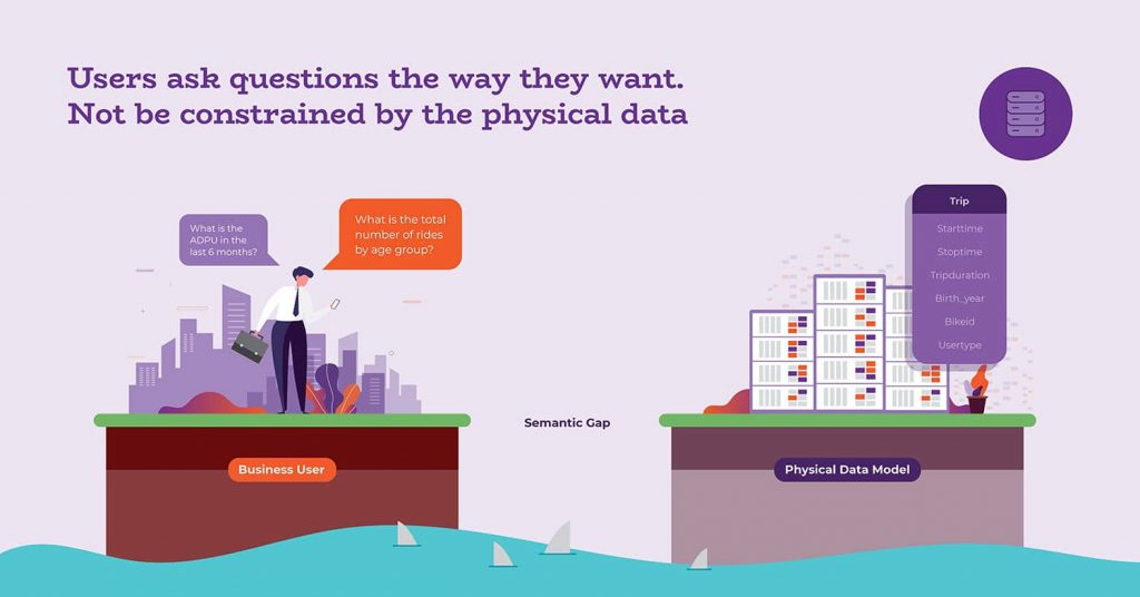 We refer to this gap between the business user’s understanding of the world and the raw data that is present in a database as a “semantic gap”. This semantic gap must be bridged before the user’s query can be answered.