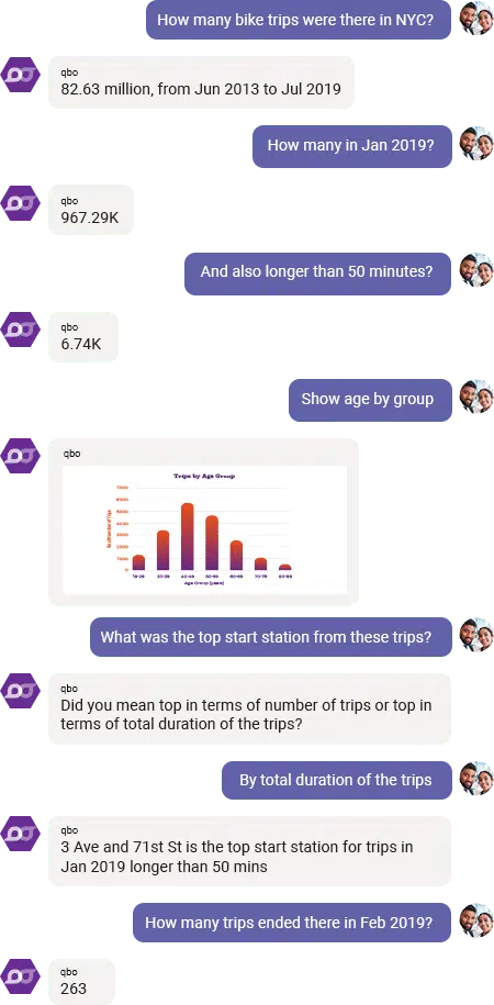 orate rich context. A user may start with a question like “How many bike trips were there in NYC?“, and after getting the answer, may then refine her previous question by asking “How many in Jan 2019?”. Now, this refinement question must be interpreted in the context of the previous question. This dramatically simplifies the interaction for the user.