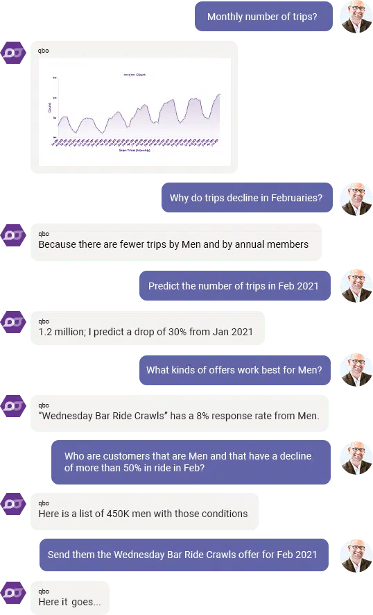 Finally, a most interesting feature of conversational analytics is that the human is not the one that needs to initiate the conversation! The bot can take the first step in engaging with a human when it feels there’s some benefit in informing the human of some fact or analysis. With repeated interactions, the bot can learn when and when not to initiate a conversation; and on what topics.