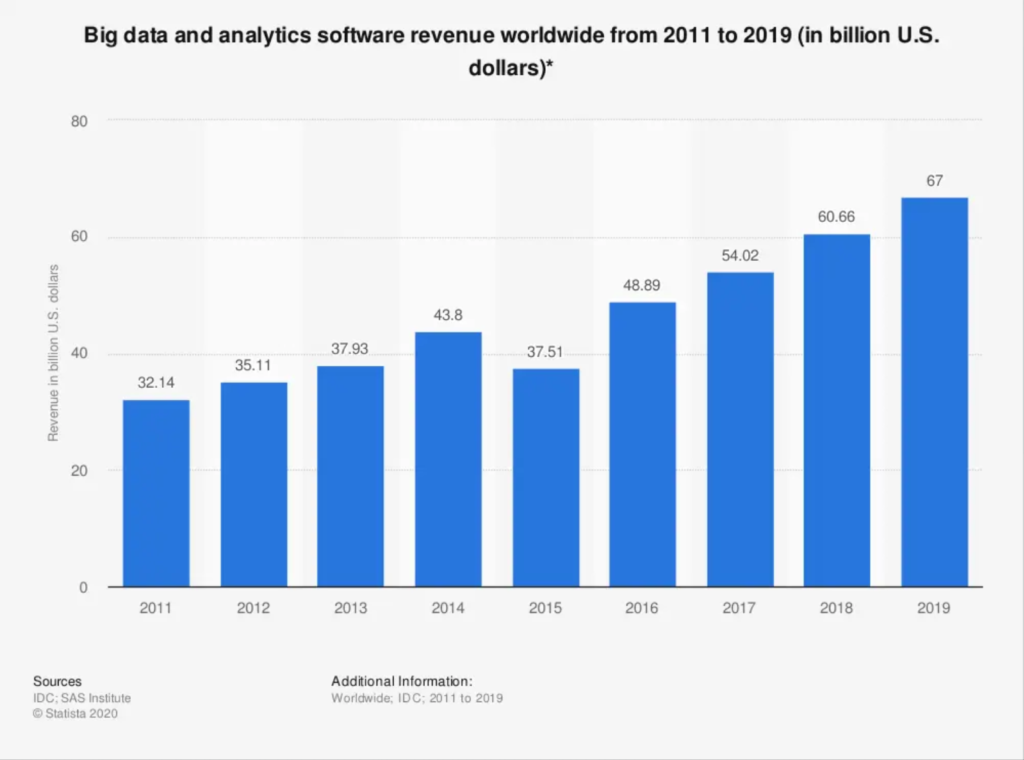 This is evident with the ever-increasing growth in revenue of the big data and analytics software market which showed a 10.4% jump to US$67 billion in 2019 as compared to US$60 billion in 2018.