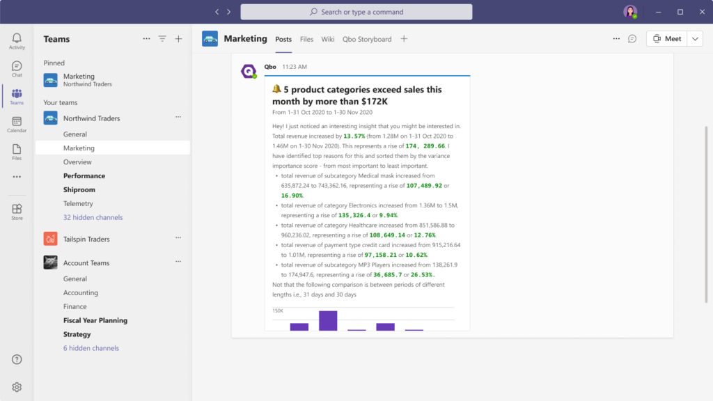 Qbo, for example, provides users with dynamic real-time analysis and insights generation. Through the power of conversational analytics, the tool will automatically engage with users when there is something of value to showcase.