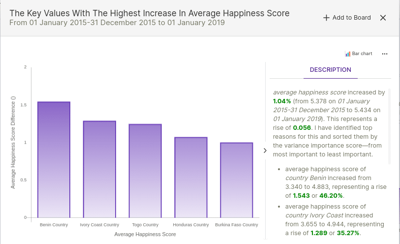 In the description part, firstly, the information about whether the main metric is increased or decreased in the specified time intervals is given. Secondly, the reasons for this change are explained. In this example, Qbo explains the top reasons for the increase in average happiness score are the increase in the happiness scores of countries like Benin, Ivory Coast, Togo, Honduras and Burkina Faso. It is quite interesting that several West African countries have seen marked improvements in happiness from 2015 to 2019.