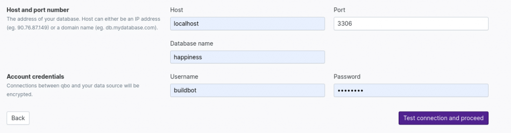 After that, account credentials and database information are required. After completing, you can press the “Test connection and proceed” button.