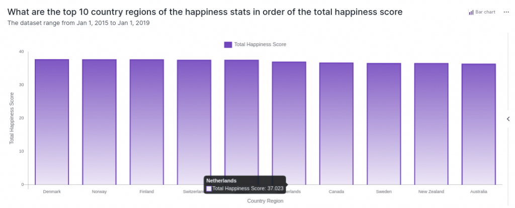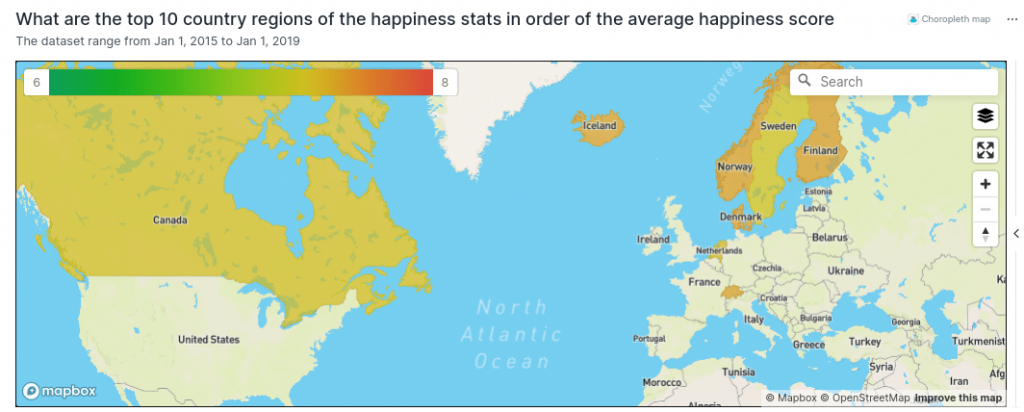 Using augmented intelligence, the tool is able to show that Nordic countries have the highest total happiness scores.