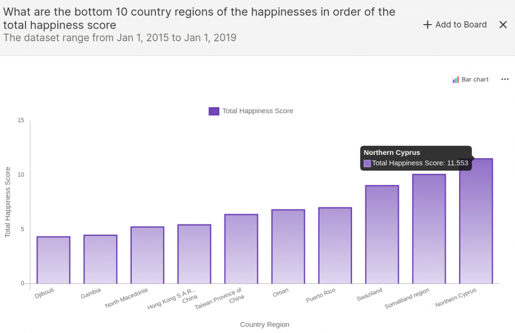 When we ask for the bottom 10 countries in order of total happiness score, we get Northern Cyprus and North Macedonia as some of the countries with the lowest levels of happiness.