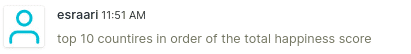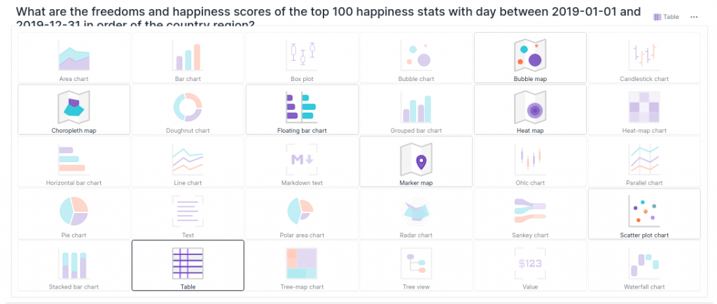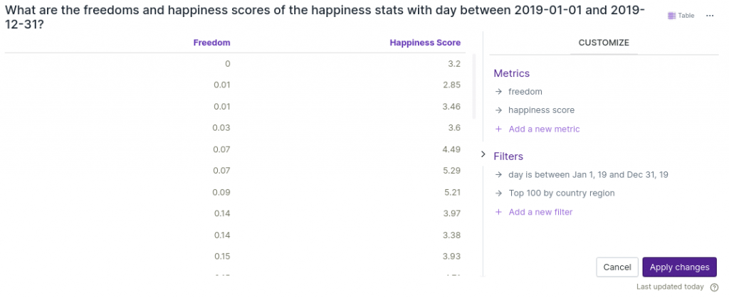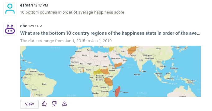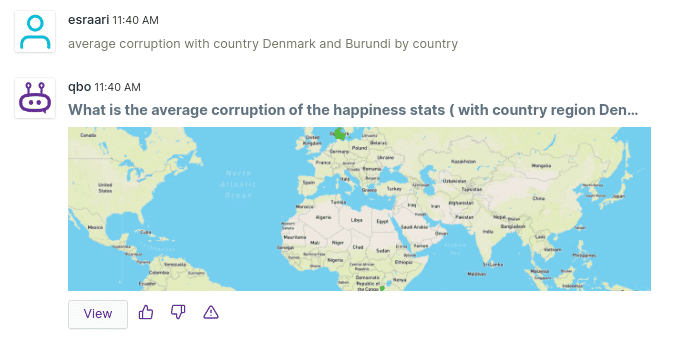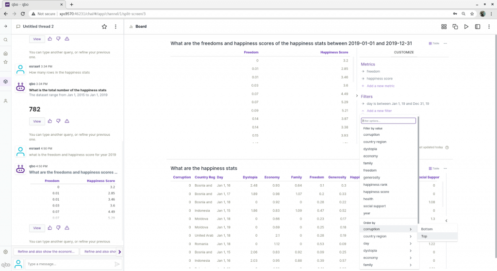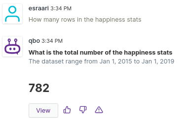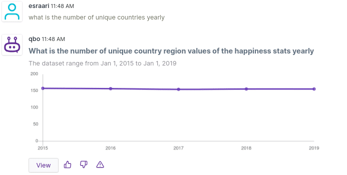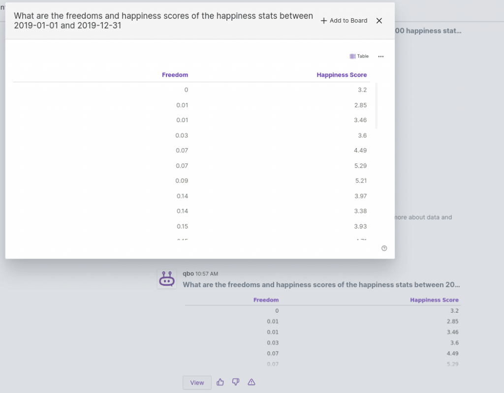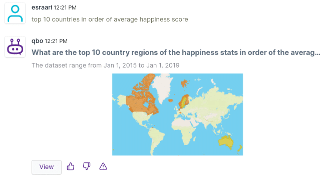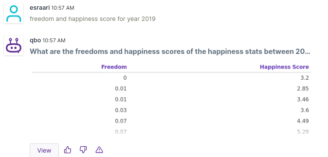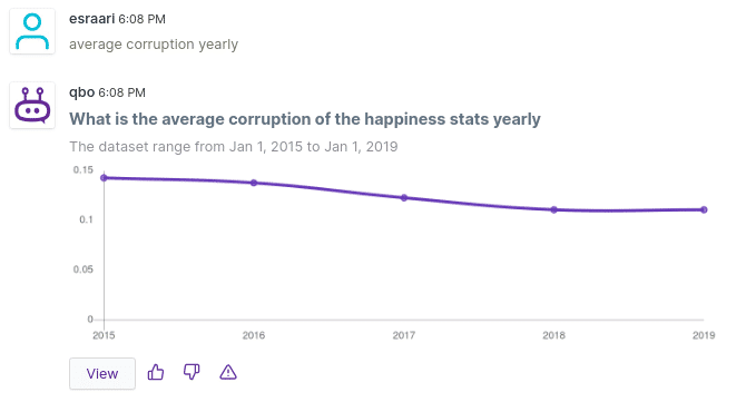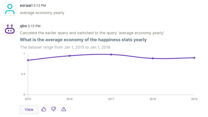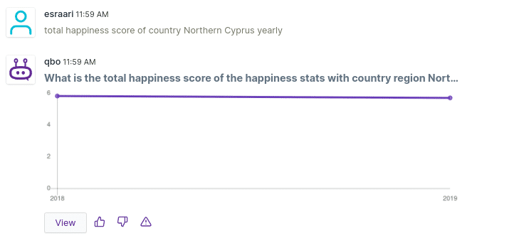 If we type “what is the freedom and happiness score for year 2019” , Qbo directly recognizes the question and converts to a sql query and gets the data using augmented intelligence.