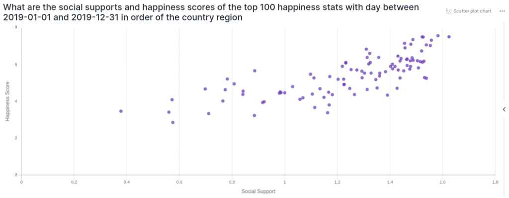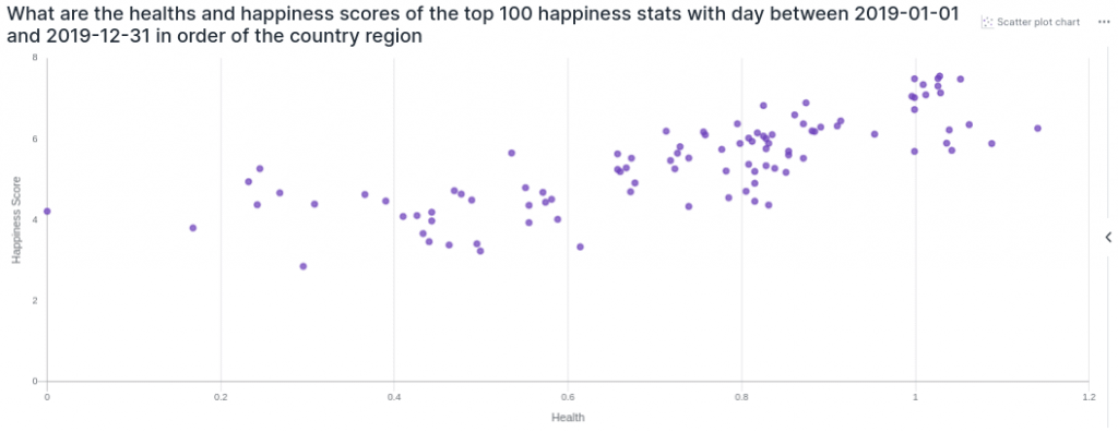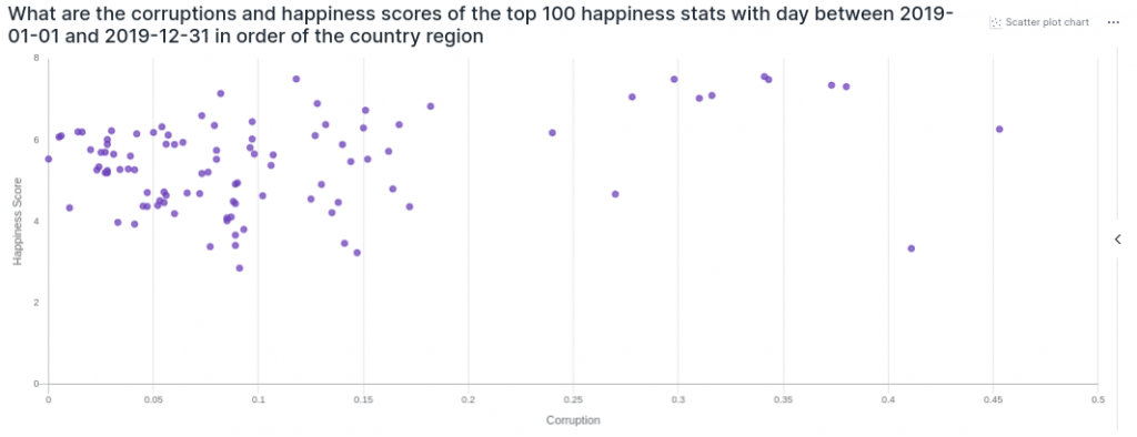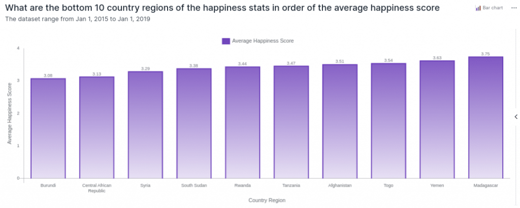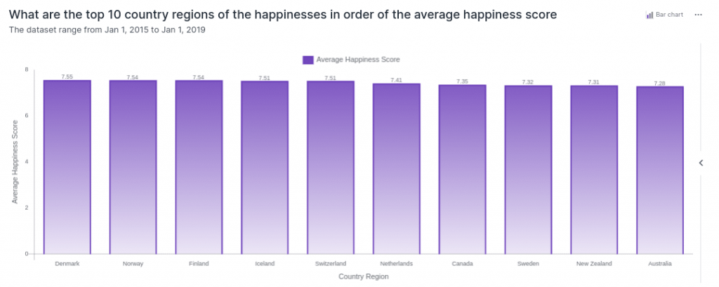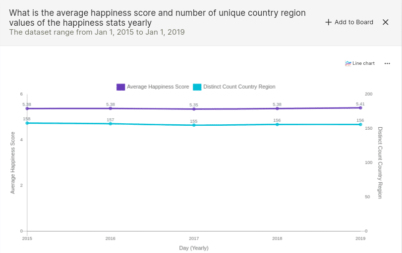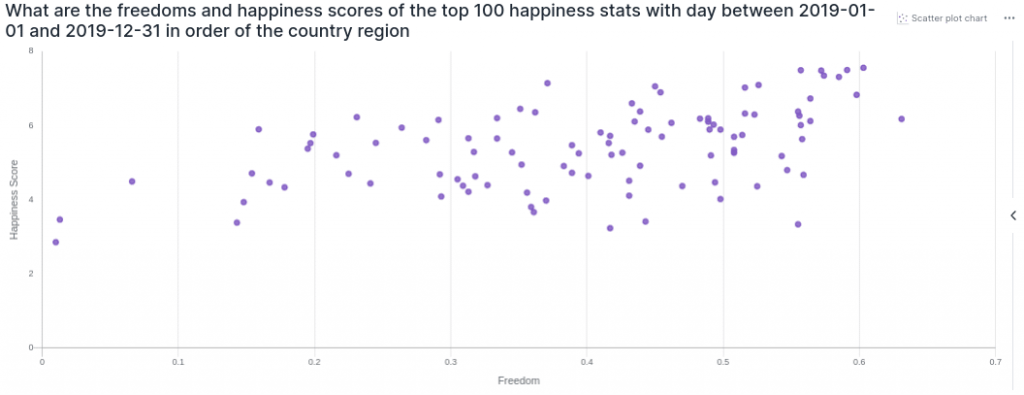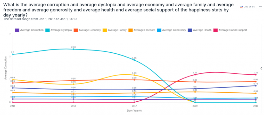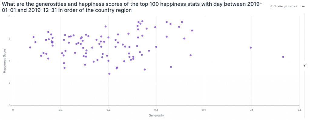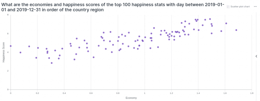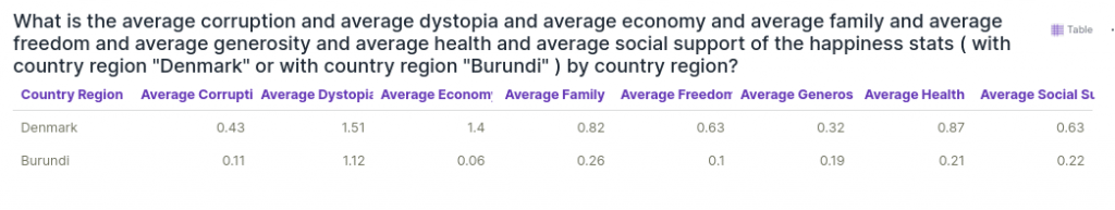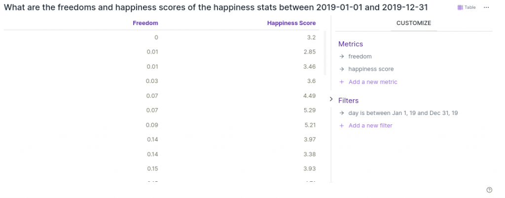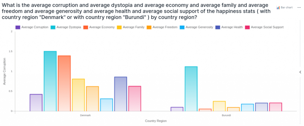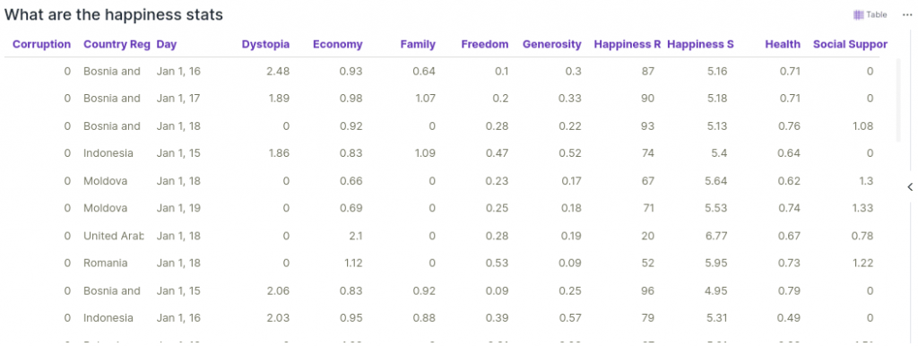 Let’s get familiar with this dataset using conversational analytics. Let’s start by looking at a sample of the data. We can do this with a query of the form “What are the happiness stats”. As we can see, the various life factors and happiness scores are in the expected range of 0 to 10.