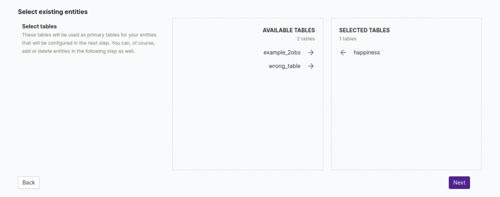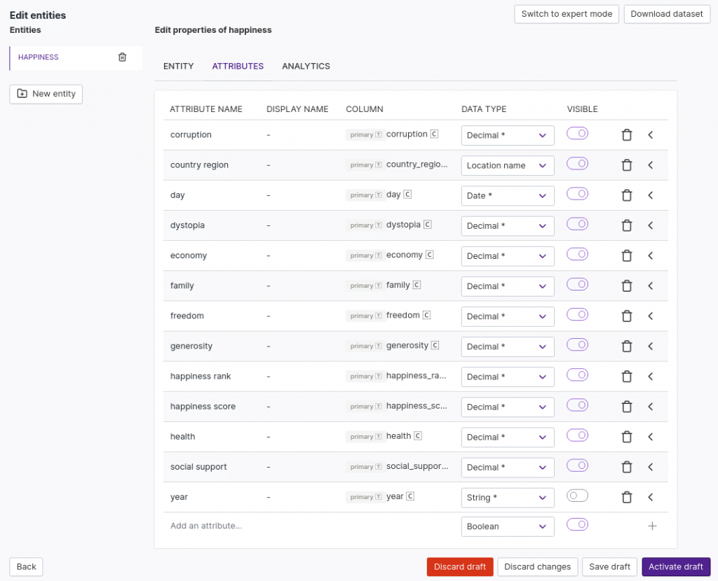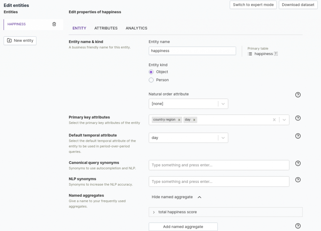 Selected tables are defined as entities, in the attributes section we can enable/disable desired attributes, change data types, and add synonyms to increase efficiency and accuracy while querying. We kept it for this part.