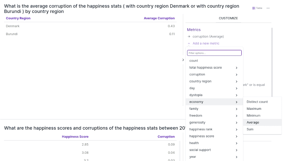 Hint: We did not actually type that long natural query in the chart above. We actually asked a simple question (“average corruption yearly”) Hint: as shown below, and then we added other metrics from the customization tab in UI. Qbo automatically generates an equivalent natural language query to reflect the customizations performed from the UI.