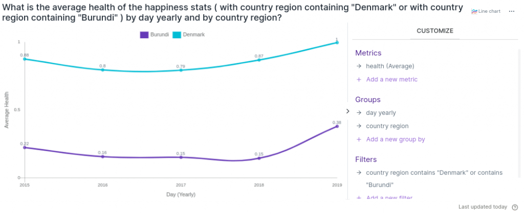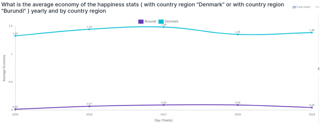 We deleted the economy(average) metric and added health (average) in the Metrics section. Both have a very similar trend but apparently Denmark’s score is still very high compared to Burundi’s. While both were in a decreasing trend until 2017, they started to increase from 2018.