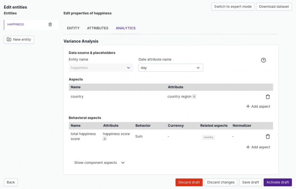 Last, but not the least, we configure variance analysis. This is one of the out-of-the-box diagnostic analytics supported by Qbo. Documentation on how to configure the analyses can be found from here. We can now ask questions like “compare total happiness score for 2019 and 2018” with the variance analytics.