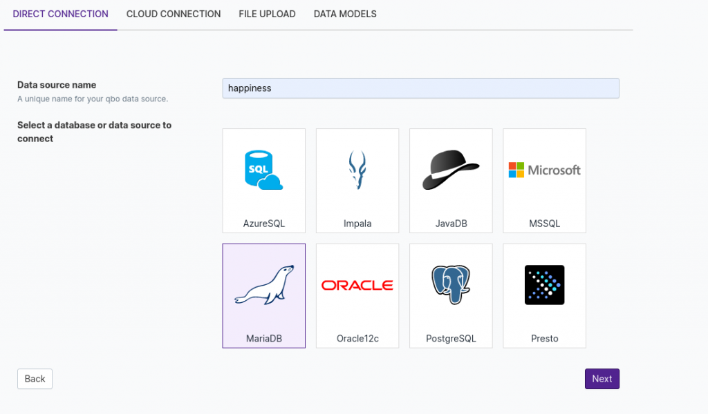 After the data is successfully loaded, we are ready to connect the data with Qbo. In the UI, we used a direct connection, chose MariaDB as the data source and named the dataset as happiness.